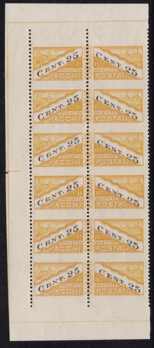 1946 SAN MARINO, Postpakete Nr. 19/IIc 25c. gelb-schwarz MNH / ** SECHSSTREIFEN ND HORIZONTAL Sächsischer Katalog Euro 330 M / Lot 000