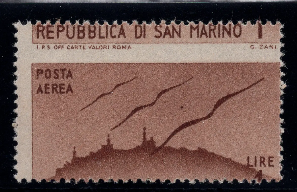 MNH - Vollgummi - 1946 Ansichten Luftpost Lire 1 Nr. 52durch waagerechte Verzahnung stark nach oben verschoben, so dass der Schriftzug Republik San Marino oben statt unten steht, neuer perfekter Vollgummi - Kat. euro 250 Cod. 3150/WEB