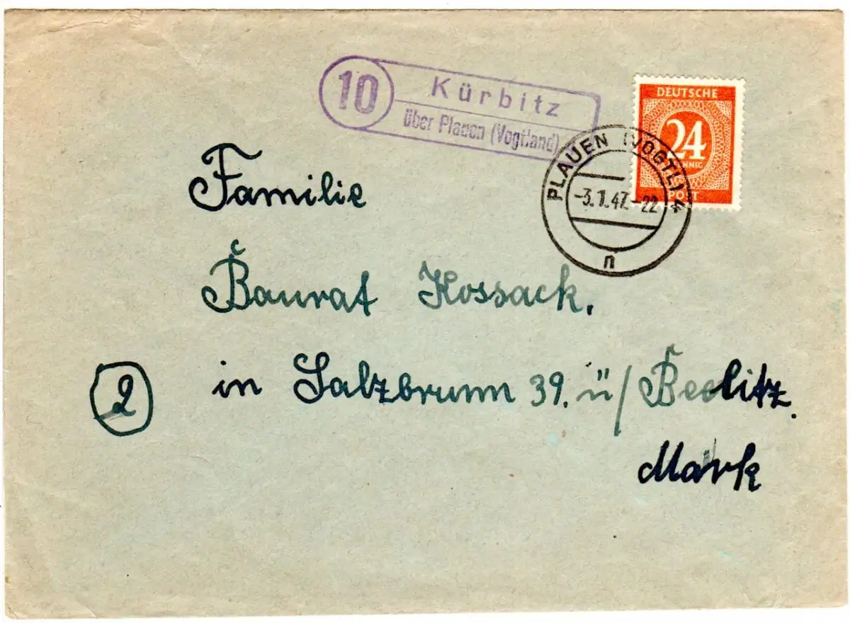 1947, Landpost Stempel 10 KUERBITZ über Plauen auf Brief m. 24 Pf.
