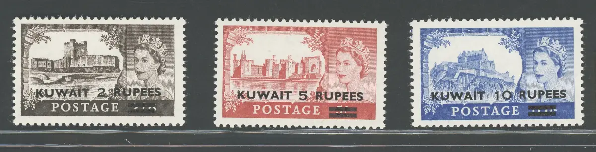 1955-57 KUWAIT, Stanley Gibbons Nr. 107-09 - 3 Werte - MNH ** BRIEFMARKEN GROSSBRITANNIEN ÜBERDRUCKT Stanley Gibbons 2020 30 Lot 301-9