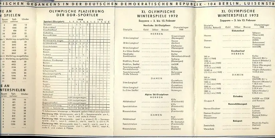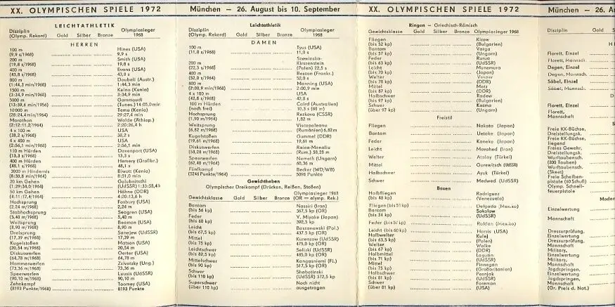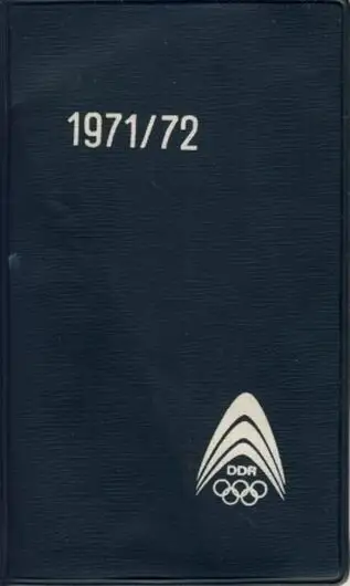 sehr guter Zustand, geringe Gebrauchs- und Alterungsspuren: Deckel leicht angeknickt, der längere Leporello enthält das Kalendarium für die Jahre 1971 und 1972 der kürzere enthält, in Vorbereitung auf Olympia 1972 in München, die Gedenk- und feiertage der DDR für 1971 und 1972, Informationen zum Förderabzeichen der Olympischen Gesellschaft der DDR, Statistiken zur Teilnahme an Olympischen Spielen und zur olympischen Platzierung der DDR-Sportler sowie eine Aufstellung der Sportarten und Wettkämpfe der Olympischen Spiele (Winter und Sommer) 1972 mit der Angabe des Olympiasiegers von 1968 und der Möglichkeit, die drei Erstplatzierten von 1972 manuell einzutragen (unbenutzt), Kunststoff, ca. 9,5 x 15,5, 2 Leporellos mit 27 und 17 Seiten in einem Kunstoff-Umschlag