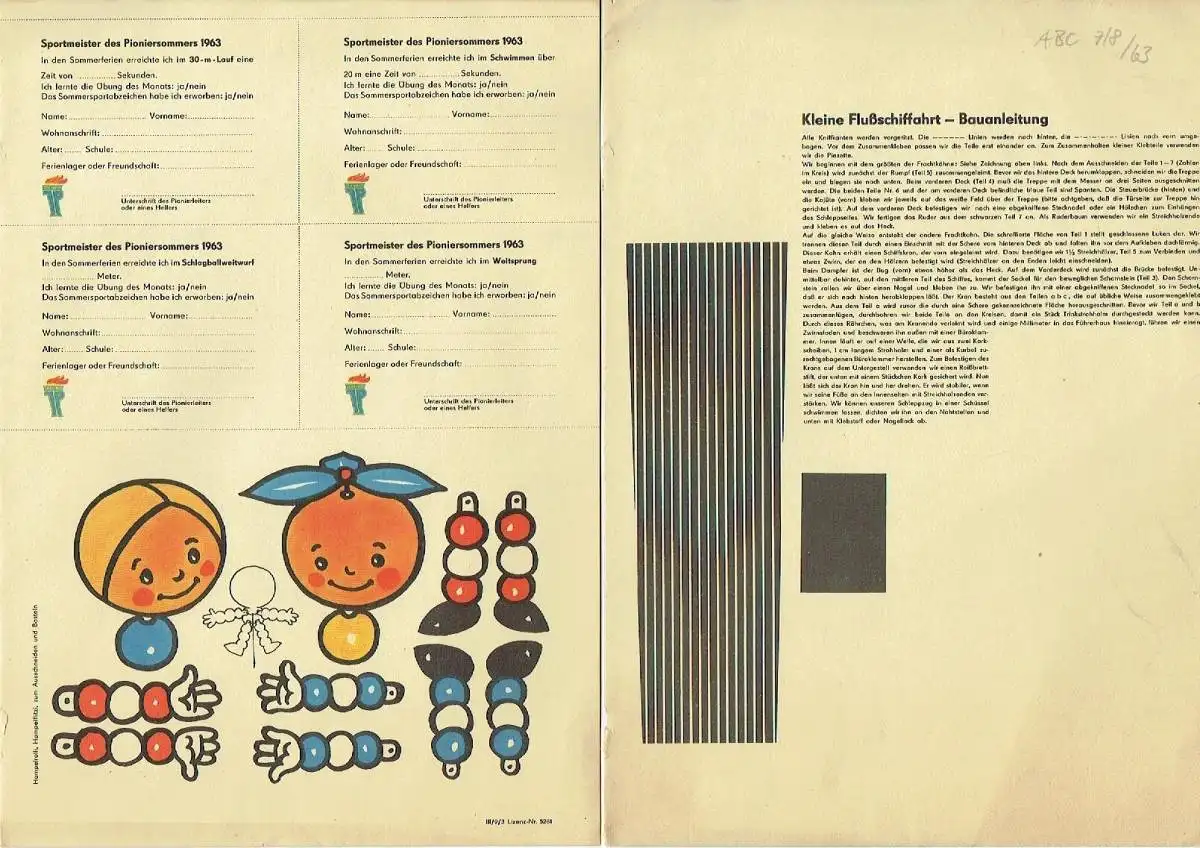 Bastelbogen "Kleine Flußschiffahrt" mit Frachtkähnen und Kran 2. Beilage mit Bastelbogen von 2 Hampelmännern, Aufgaben für die Verkehrsurkunde, Sammelscheine von Korbine Früchtchen etc