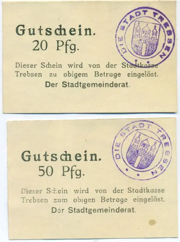 2 Gutscheine der Stadt Trebsen über 25 Pfg. und 50 Pfg.