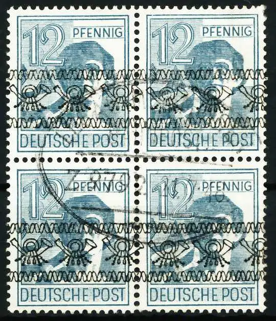 12 Pfg Wert aus der 2. Kontrollratsausgabe mit Bandaufdruck Posthörnchen, Bahnpoststempel