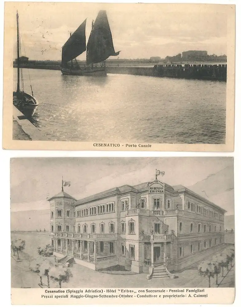 Bemerkungen: 2 Postkarten bzw. Photokarten mit Ansichten von "Porto Canale" u. dem "Hotel Eritrea" in Cesenatico (Emilia-Romagna). Beide gelaufen mit Briefmarken und Stempel.