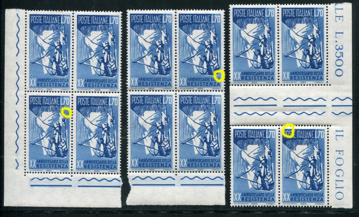 Zwanzig Jahre Widerstand Lire 70 - 3 verschiedene Sorten Vollgummi - drei verschiedene Sorten der Viertelübertragung (eine in der Mitte durch Gruppenzwischenraum getrennt) - Position 10 IV Fleckplatte über O von POSTEN + Position 34 der IV TabelleWeißer Punkt unten rechts + Position 41 der IV Tabelle Weißer Punkt unter 70 - Interessantes Set für den Spezialisten - Code 1109/OUTLET