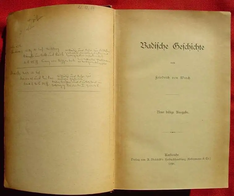 Artikelbeschreibung und Zustand : Siehe Scan. "Badische Geschichte". Von Friedrich v. Weech. 648 Seiten. Halbleinenband mit Wappen-Abbildung u. Goldpraegeschrift. Format ca. 15 x 23 cm. Gefaerbter Schnitt. Mit Namens- u. Inhaltsverzeichnis. Verlag A. Bielefeld's Hofbuchhandlung (Liebermann & Cie.), Karlsruhe 1896. Einband etwas gebraucht, innen gut