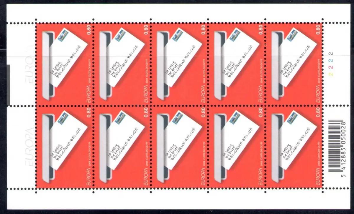 2008 EUROPA CEPT Belgien, 1 Kleinbogen mit 10 Werten, Der Brief MNH **, neu und perfekt, Vollgummi und original.