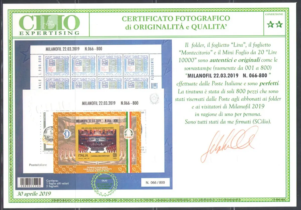 2019 Italien - Folder - Valori nel Tempo n. 646 - MNH ** enthält IL MINIFOGLIO von 20 Exemplaren à 10.000 Lire unified n. 1652, das Blatt Lira Italiana Unified BF74A und das Foglietto Montecitorio Unifiedato n. BF95A, Alle drei Zettel mit Milanofil-Aufdruck 22.03.2019 und die Nummer 066-800Wurden alle nur in Foldern während der Philatelistischen Konferenz von 800 ausgegeben.2019 ist die Auflage von Milanofil.