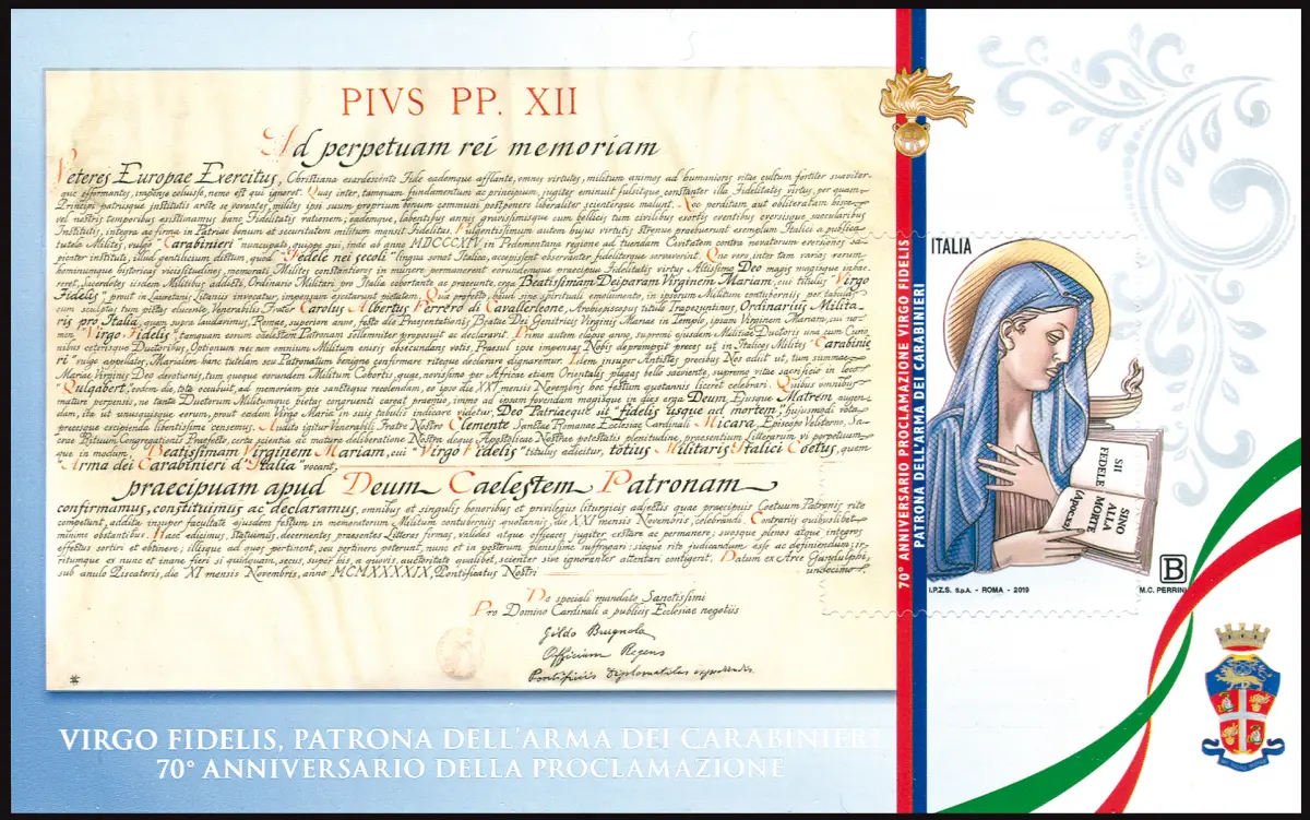 2019 Virgo Fidelis Arma dei Carabinieri Sortenbogen Vollgummi MNH - 2019 Virgo Fidelis Arma dei Carabinieri - Zettel Nr. 115 mit stark nach links verschobener Stempelstanzung, so dass außen das gesamte B zu sehen ist - Selten, wobei die Briefmarke des Nennwerts völlig fehlt Cod. 753/16