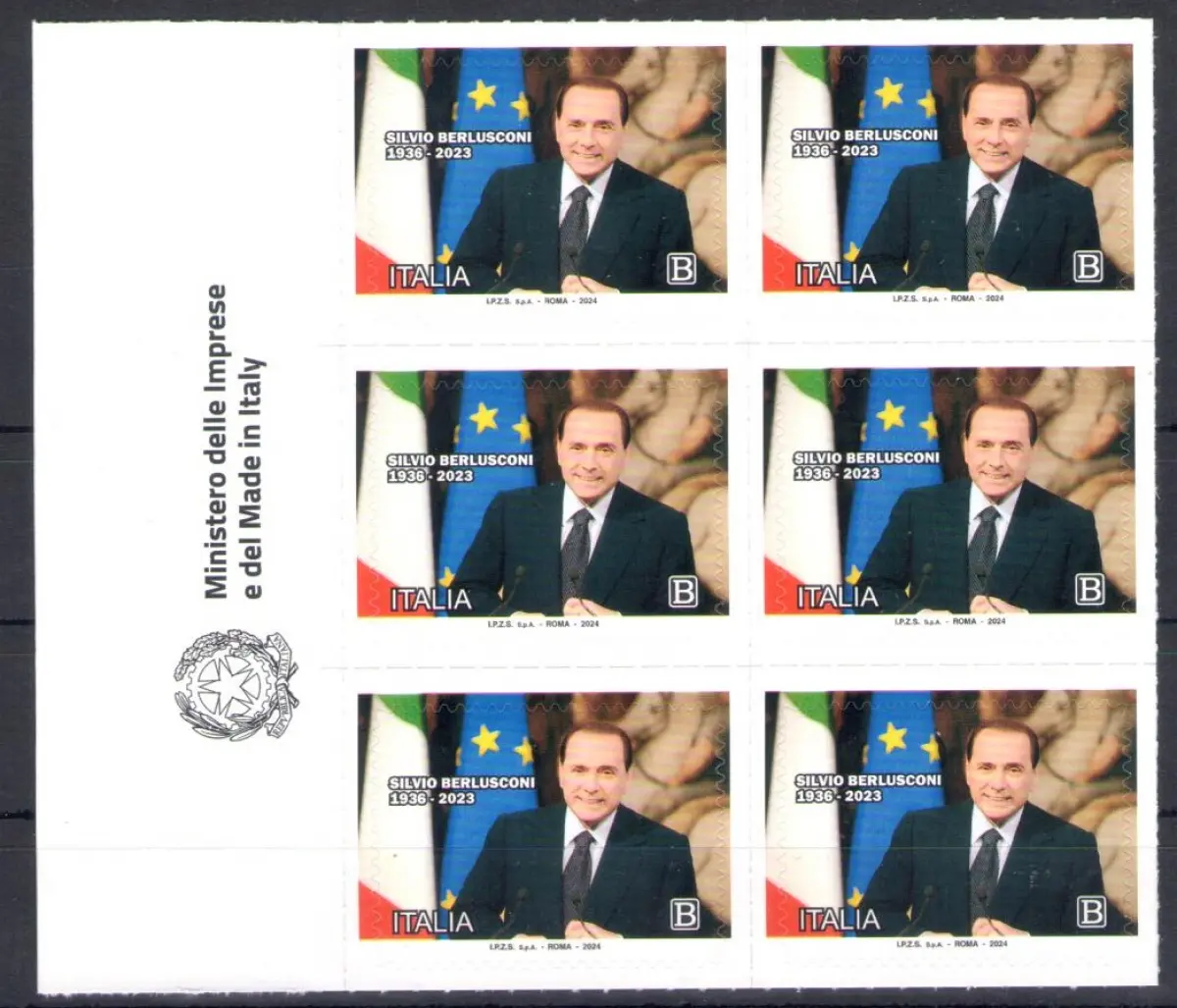 2024 Italien - Silvio Berlusconi Block von 6 - MNH ** Block von 6 und auf der Blattspitze rechts Symbol der Italienischen Republik und Inschrift Ministerium für Unternehmen und Made in Italy