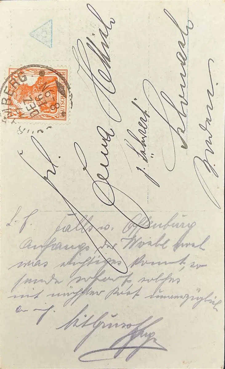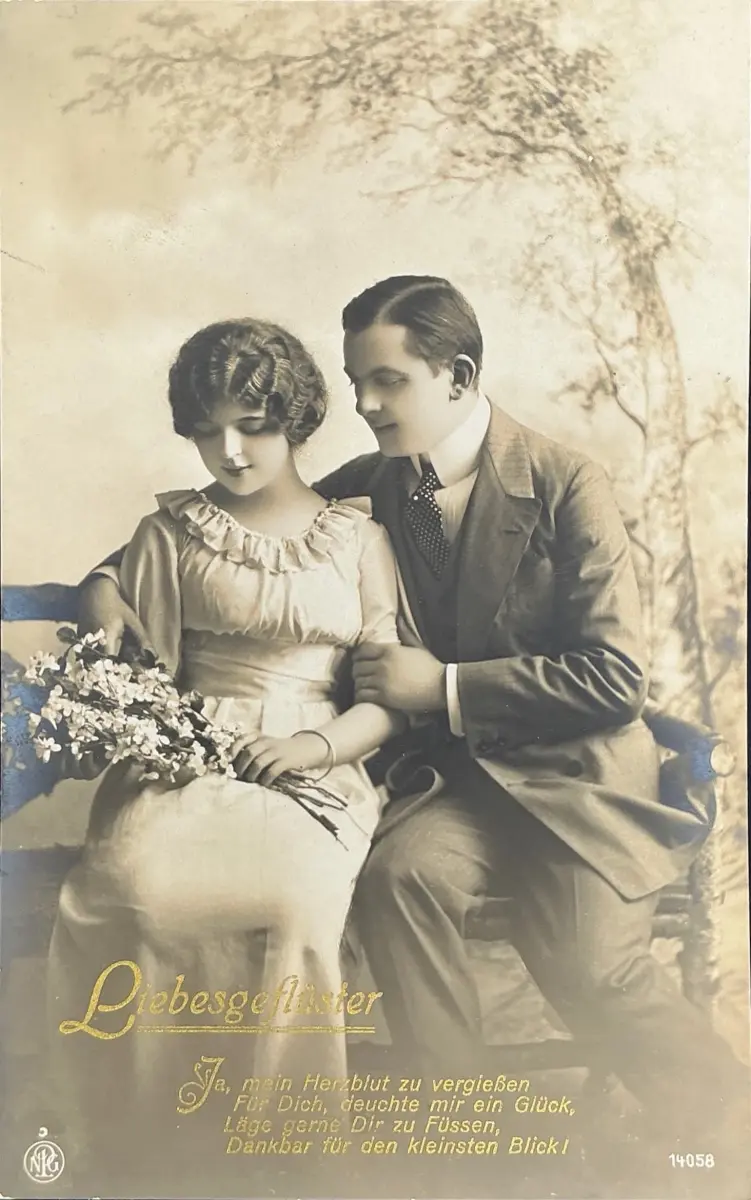 Romantische Liebespostkarte mit Goldschrift „Liebesgeflüster“ und poetischem Text. Motiv: junges Paar mit Blütenzweigen auf Bank. Rückseite mit Germania 10 Pfennig orange (Deutsches Reich), klar gestempelt Nürnberg 16.12.1908, Adresse und handschriftliche Nachricht.