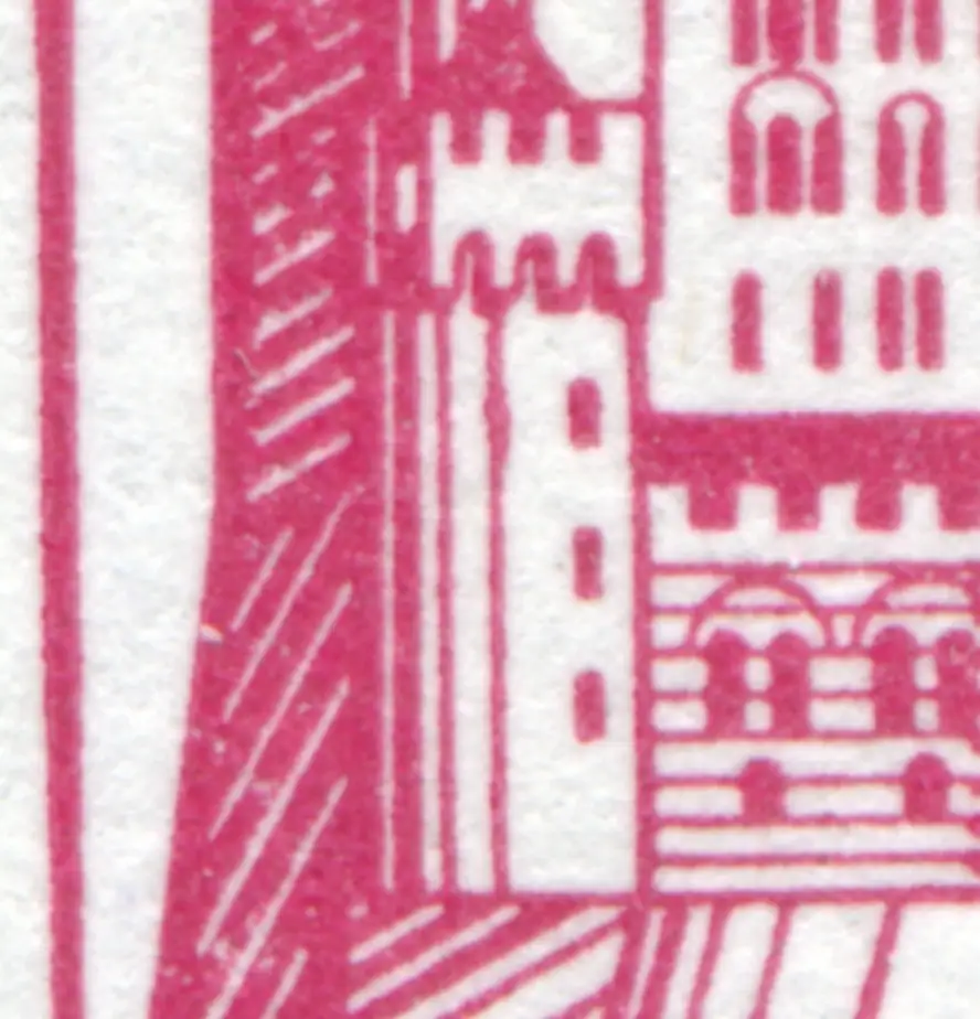 4. Deckelseite: Sammlermarken, weite Deckelperforation, mit Plattenfehler VIII: verdickte Turmlinie, Feld 5