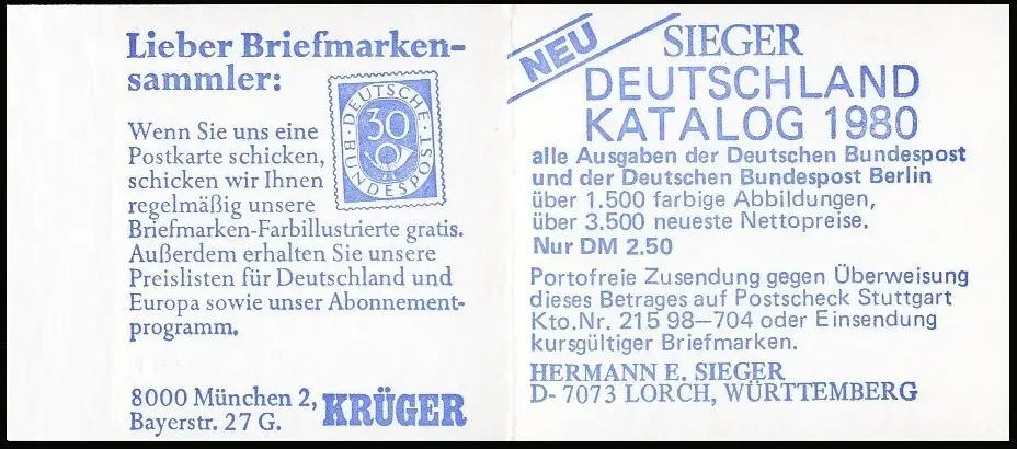 2 Adressen, Briefmarkensammler/SIEGER-Katalog; PLF II: senkrechte Verbindung der Dachbalken, Feld 1