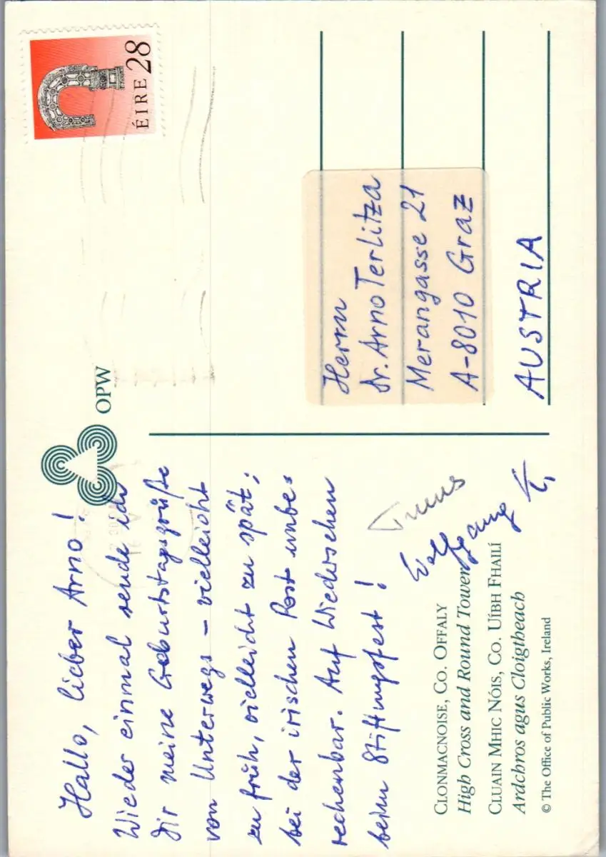 23845 - Irland - Clonmacnoise , County Offaly , High Cross and Round Tower - gelaufen