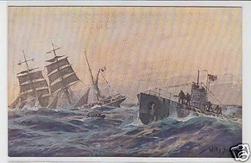 Französische Bark wird durch deutsches U-Boot im Atlantik versenkt, von Prof.Willy Stöwer, ungelaufen, guter Zustand siehe Bild,