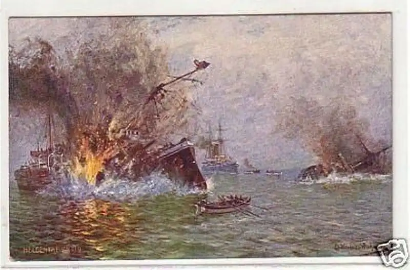 Das deutsche Unterseeboot U 9 schießt die drei einglischen Panzerkreuzer "Aboukir" "Hogue" und "Cressy" in den Grund,