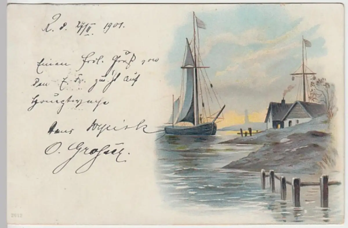- (27441) Künstler Ansichtskarte, postcard, PPC - Segelschiff, Häuser am Ufer 1901