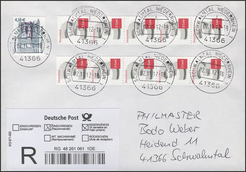 mit Dauermarke 4,10 Euro auf portogerechtem R-Eigenhändig-FDC vom 2.11.2012