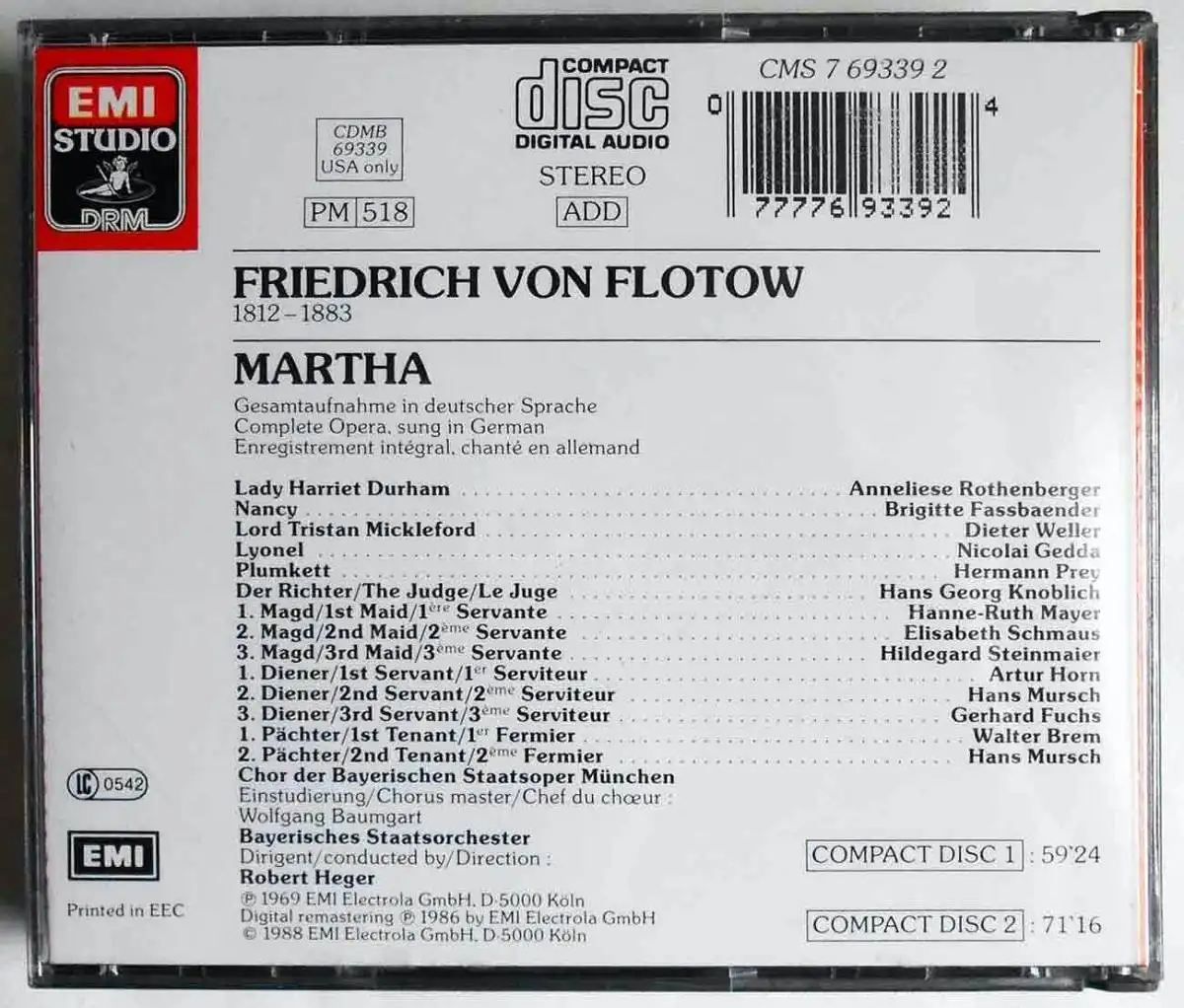 2CD Box Flotow: Martha (EMI) Rothenberger Fassbaender Gedda Prey Heger 1988