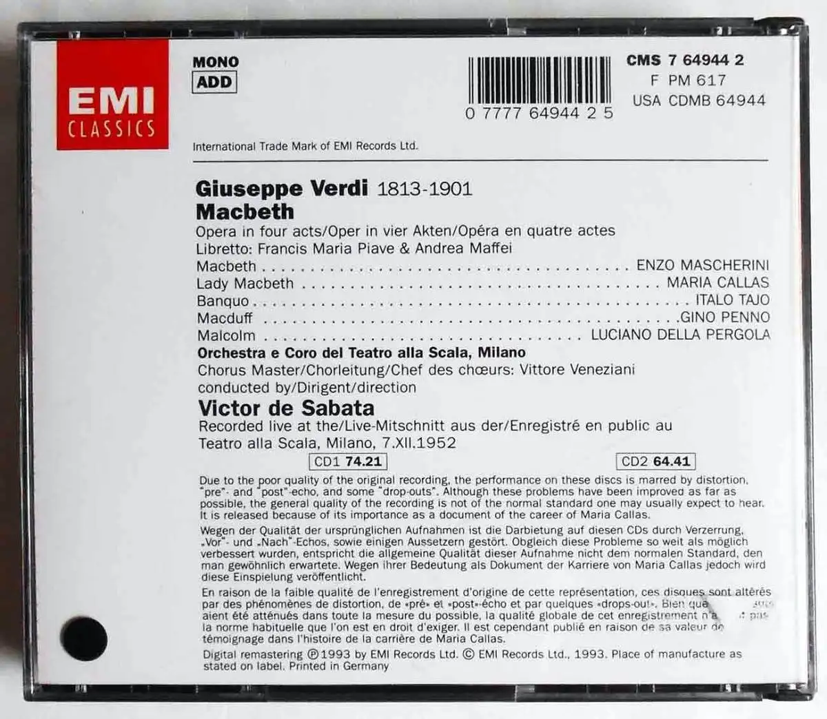 2CD Box Verdi: Macbeth - Maria Callas Victor de Sabata (EMI)