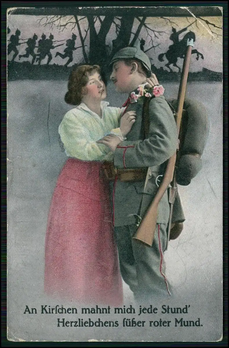 2x AK Liebesglück Soldatenliebe Abschiedsszene 1918 Berlin Feldpost gelaufen