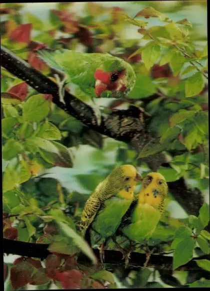 3 D Ak Wellensittiche und Papagei in einem Baum