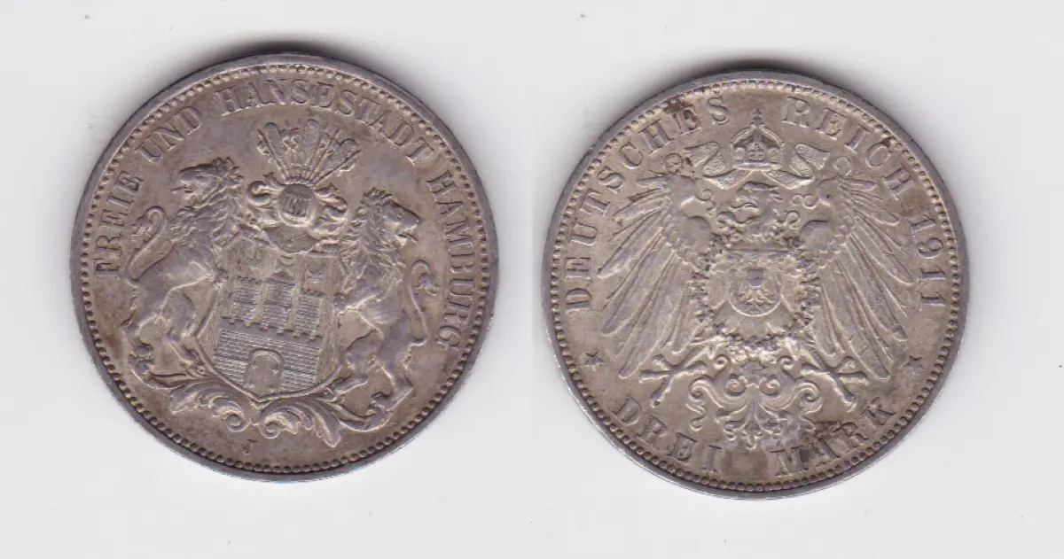 3 Mark Silbermünze Freie und Hansestadt Hamburg 1911 Jäger 64 ss (167493)