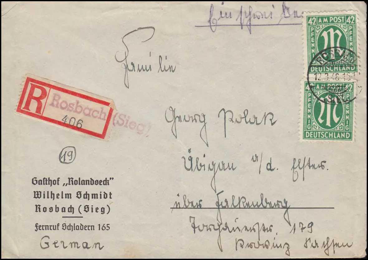 31 AM-Post 42 Pf. als MeF auf R-Brief Not-R-Zettel ROSBACH (SIEG) 12.3.1946