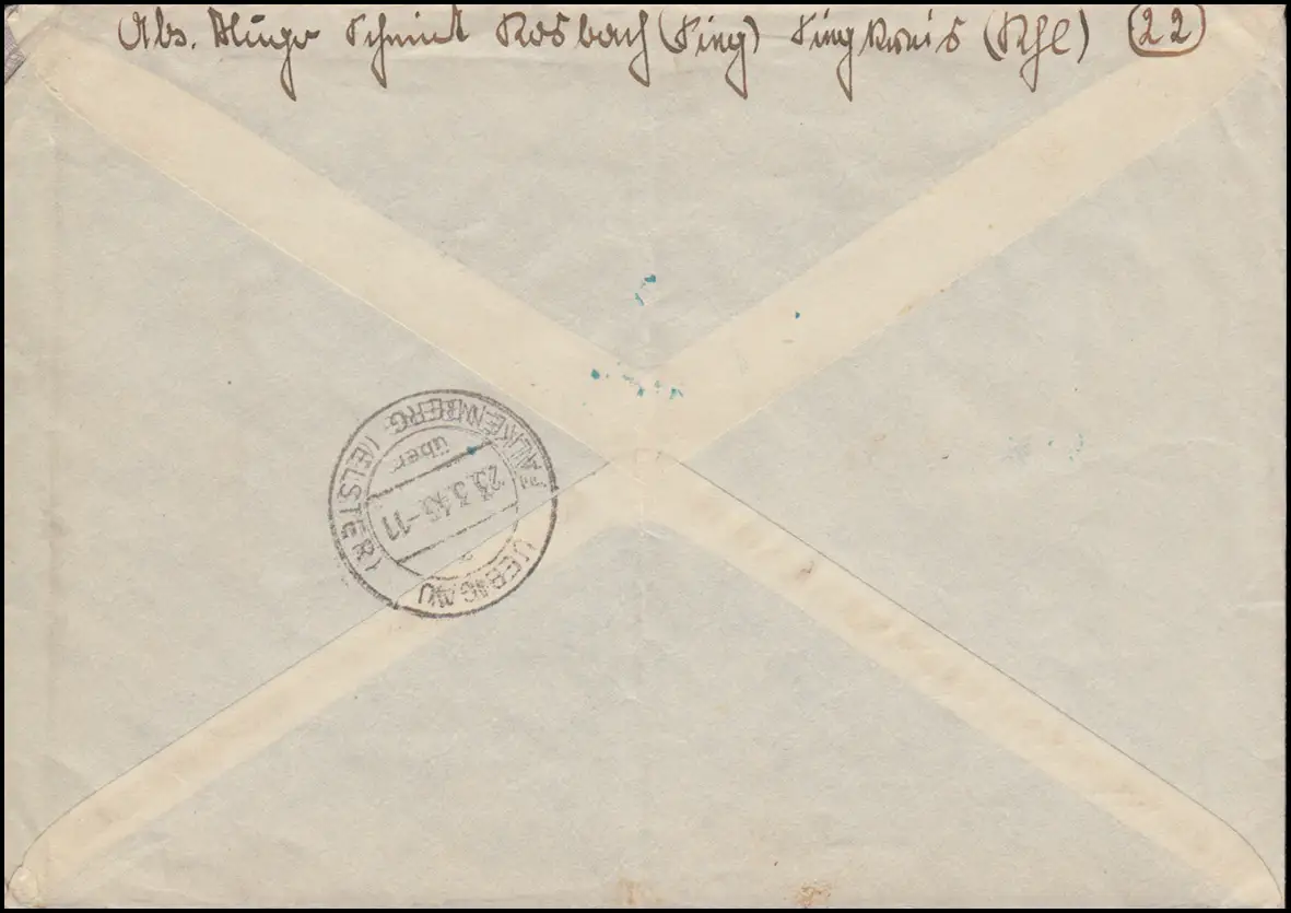 vom Gasthof ROLANDSECK in Rosbach / Sieg, Ankunftsstempel UEBIGAU über FALKENBERG (ELSTER) 23.3.46, Umschlag mittig gefaltet