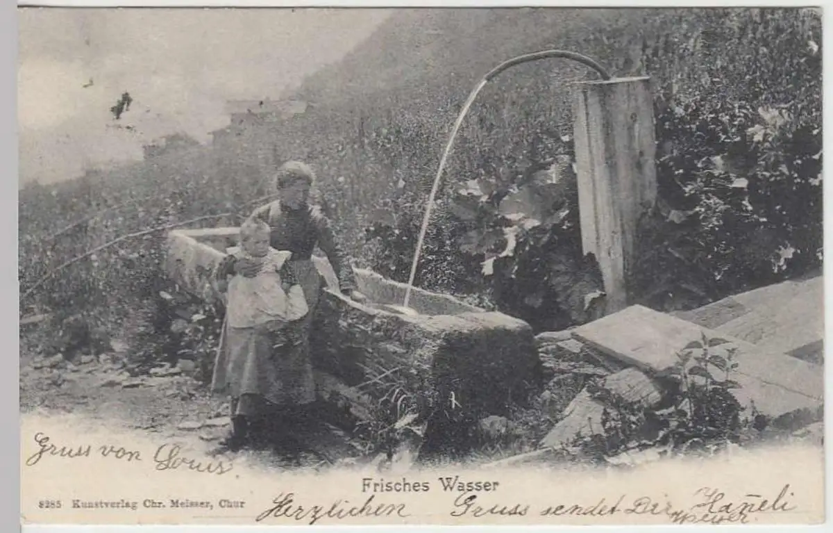 - (32486) Ansichtskarte, postcard, PPC - "Frisches Wasser", Mutter mit Kind an Tränke, 1906