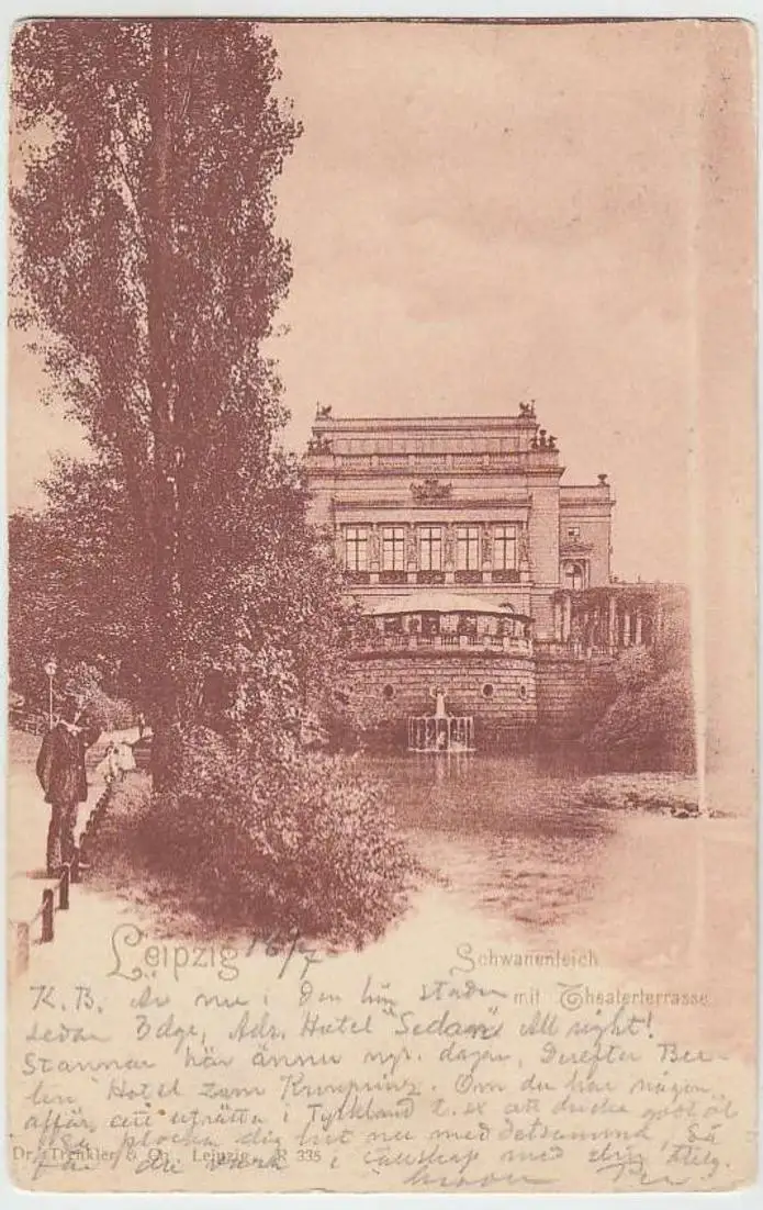 - (33608) Ansichtskarte, postcard, PPC - Leipzig, Schwanenteich mit Theaterterrasse, 1901