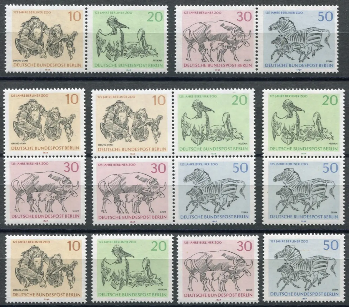 338-341 Berliner Zoo aus Block 2 mit 5 Zusammendrucken + 4 Einzelmarken, Set **