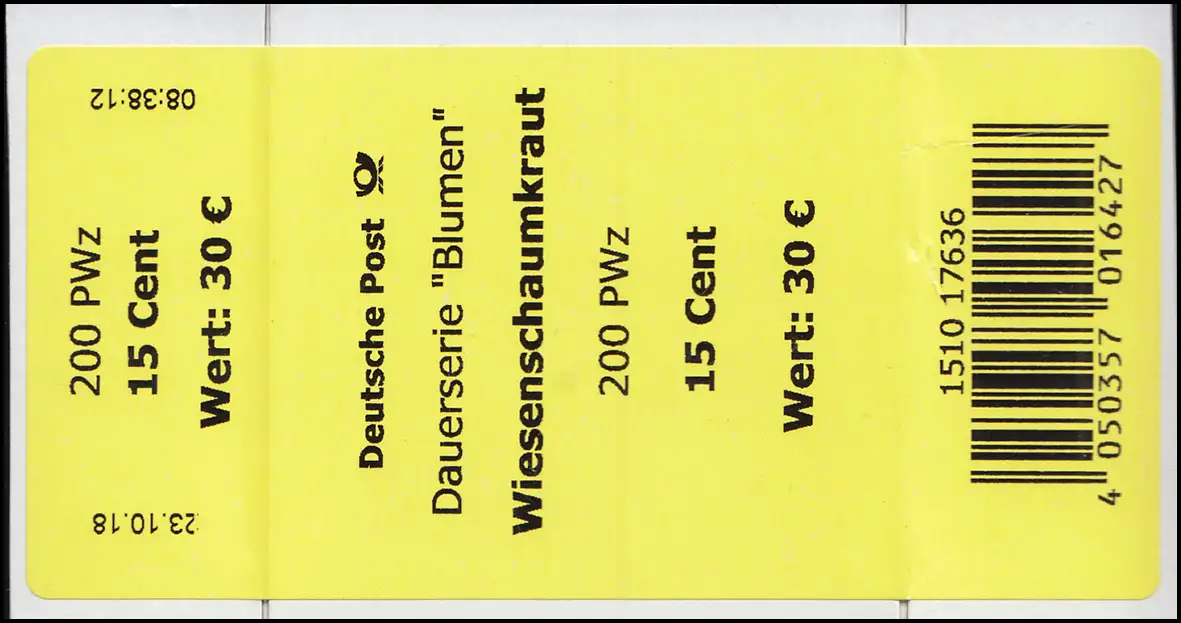 3424 Wiesenschaumkraut 15 Cent + CF Banderole / Aufkleber, große Nummer