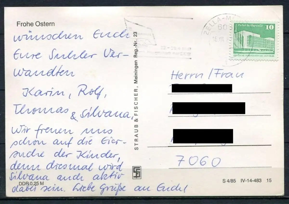 Straub & Fischer, Meiningen Reg.-Nr. 23 - S 4/85 IV-14-483 15 Die schwarzen Balken im Adressfeld sind auf dem Original nicht vorhanden.Erhaltung - siehe Scans