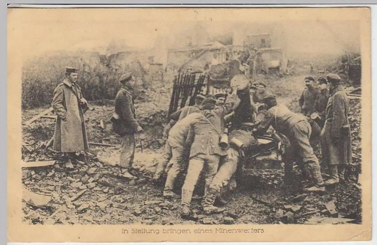 - (36755) Ansichtskarte, postcard, PPC - 1.WK In Stellung bringen eines Minenwerfers, Feldpost 1918