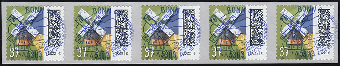 3712 Briefmühle 37 Cent sk aus 5000er, 5er-Streifen GERADE Nummer, EV-O BONN