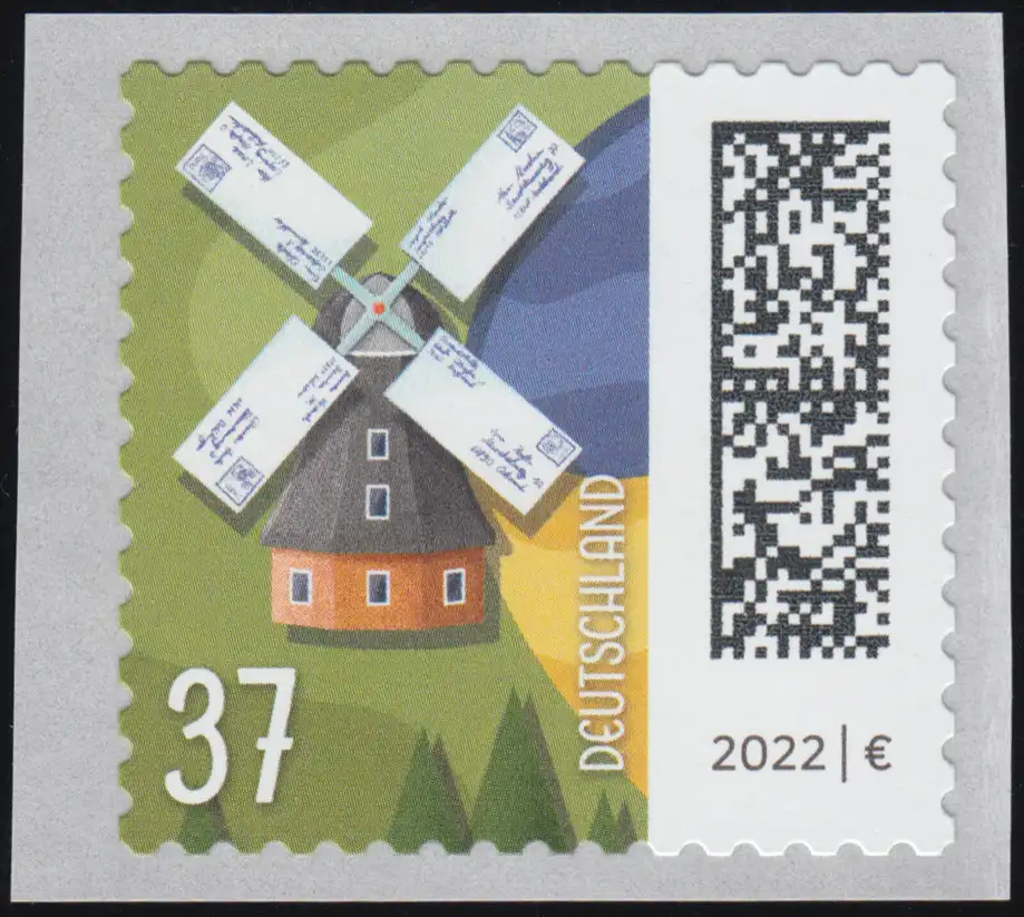 Serie: Welt der Briefe / Thema: Windmühle, deren Flügel aus Briefen bestehen 37 Cent selbstklebend von der 5000er-Rolle