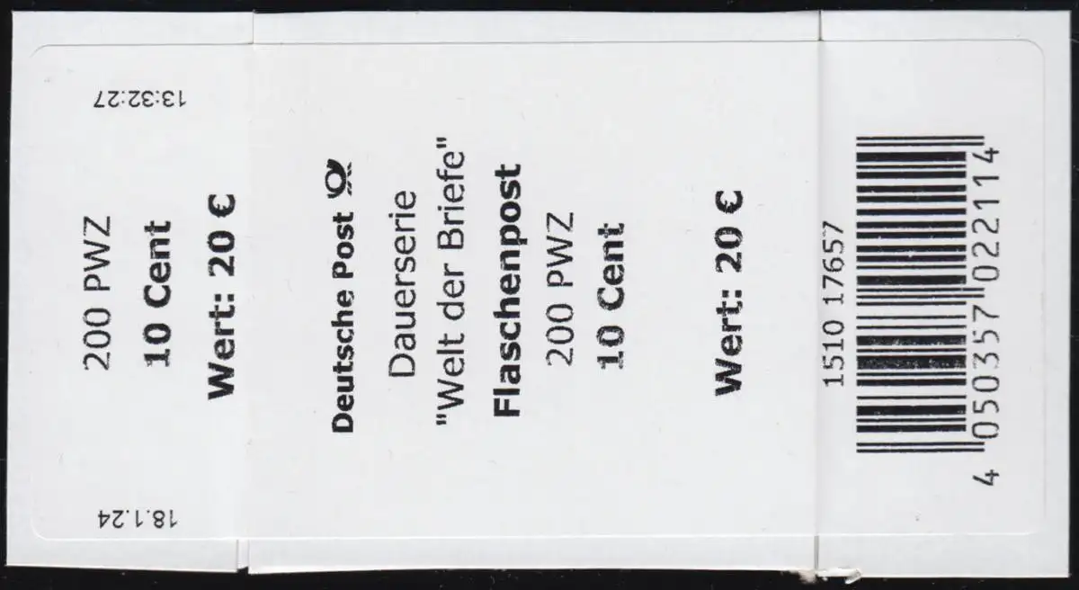 3723 Welt der Briefe: Flaschenpost 10 Cent - BANDEROLE der Rolle, 4. Auflage