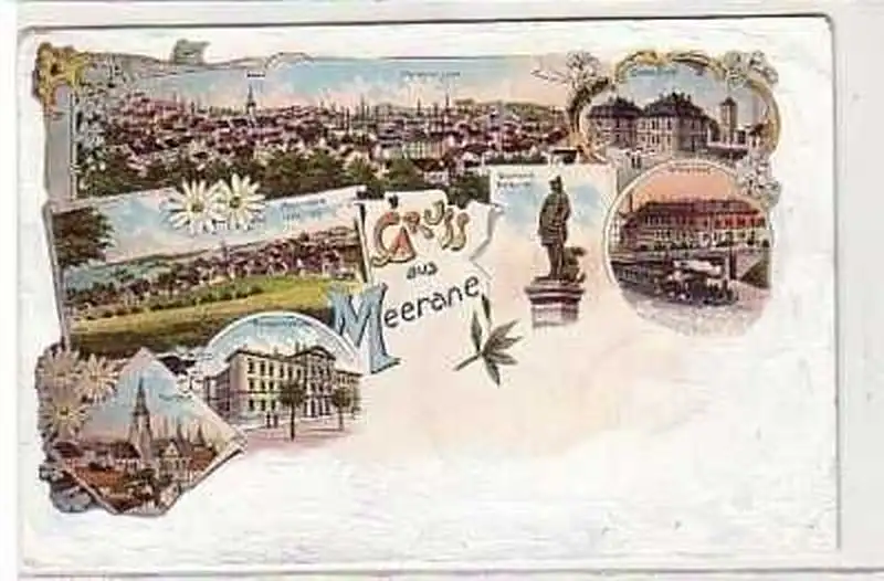schöne farbige Lithographie, Meerane 1824-1856, Meerane jetzt, Schlachthof, Webschule, Bismarckdenkmal, Kirche, Bürgerschule, ungelaufen, gebrauchte Erhaltung (leichte Altersspuren, bildseitig mit weisser Farbe "Tipp Ex"? bemalt, die Farbe läßt sich mit Mühe und Lösungsmittel wieder entfernen) siehe Bild,