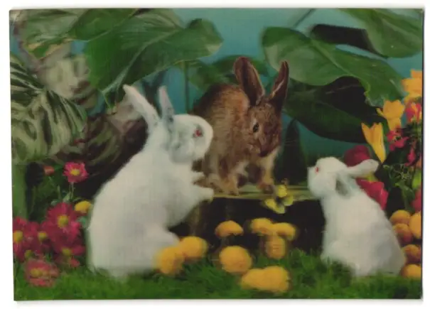 3D-AK 2 Albinokaninchen und ein braunes auf Blumenwiese