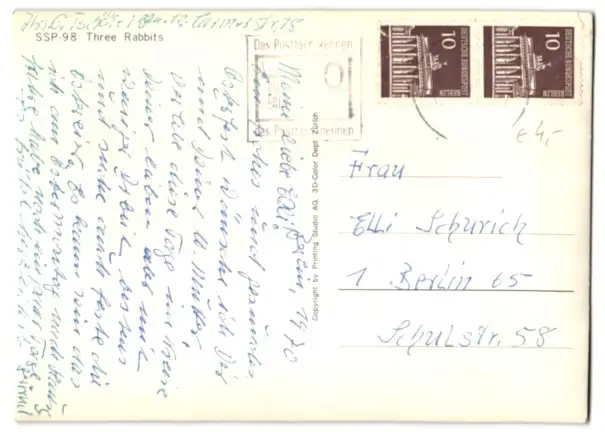 Personenbezogene Daten auf der Rückseite der Karte wurden durch blauen Textmarker unkenntlich gemacht. Die blauen Stellen sind auf die Vorderseite durchgeweicht und wirken sich negativ auf das Postkartenfoto aus