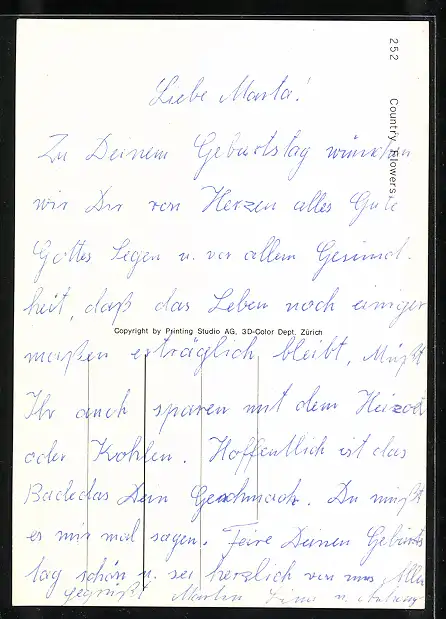 Personenbezogene Daten auf der Rückseite der Karte wurden durch blauen Textmarker unkenntlich gemacht. Die blauen Stellen sind auf die Vorderseite durchgeweicht und wirken sich negativ auf das Postkartenfoto aus