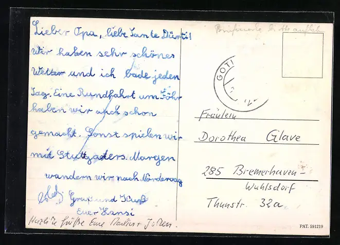 Personenbezogene Daten auf der Rückseite der Karte wurden durch blauen Textmarker unkenntlich gemacht. Die blauen Stellen sind auf die Vorderseite durchgeweicht und wirken sich negativ auf das Postkartenfoto aus