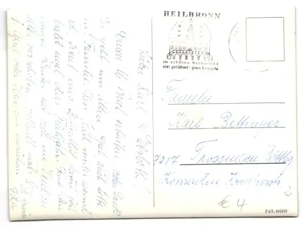 Personenbezogene Daten auf der Rückseite der Karte wurden durch blauen Textmarker unkenntlich gemacht. Die blauen Stellen sind auf die Vorderseite durchgeweicht und wirken sich negativ auf das Postkartenfoto aus