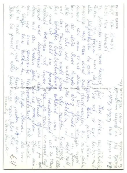 Personenbezogene Daten auf der Rückseite der Karte wurden durch blauen Textmarker unkenntlich gemacht. Die blauen Stellen sind auf die Vorderseite durchgeweicht und wirken sich negativ auf das Postkartenfoto aus