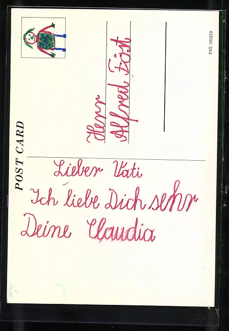 Personenbezogene Daten auf der Rückseite der Karte wurden durch blauen Textmarker unkenntlich gemacht. Die blauen Stellen sind auf die Vorderseite durchgeweicht und wirken sich negativ auf das Postkartenfoto aus
