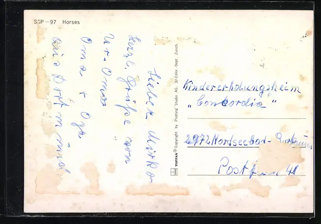 Personenbezogene Daten auf der Rückseite der Karte wurden durch blauen Textmarker unkenntlich gemacht. Die blauen Stellen sind auf die Vorderseite durchgeweicht und wirken sich negativ auf das Postkartenfoto aus