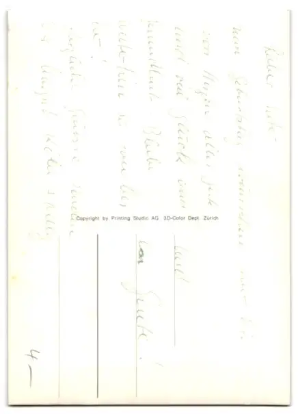Personenbezogene Daten auf der Rückseite der Karte wurden durch blauen Textmarker unkenntlich gemacht. Die blauen Stellen sind auf die Vorderseite durchgeweicht und wirken sich negativ auf das Postkartenfoto aus