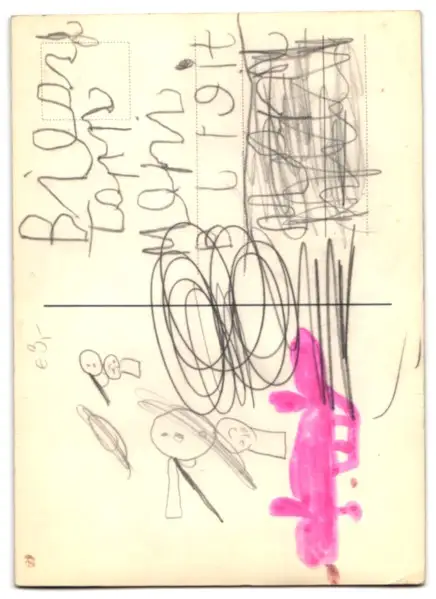 Personenbezogene Daten auf der Rückseite der Karte wurden durch blauen Textmarker unkenntlich gemacht. Die blauen Stellen sind auf die Vorderseite durchgeweicht und wirken sich negativ auf das Postkartenfoto aus